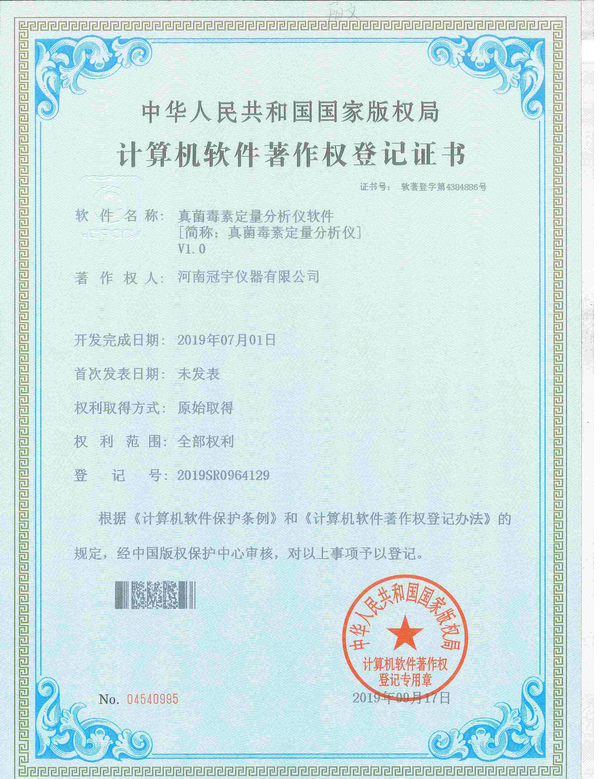 近日,河南冠宇儀器有限公司(以下簡稱:冠宇儀器)繼之前的多項軟件著作權證書及專利證書之后,又獲由中華人民共和國國家版權局頒發的一項“手持式毛反毒品痕跡定量分析儀計算機軟件著作權登記證書”,一系列的權威肯定,彰顯了冠宇儀器強大的技術研發能力,也體現出公司為客戶提供優質產品的強大決心。