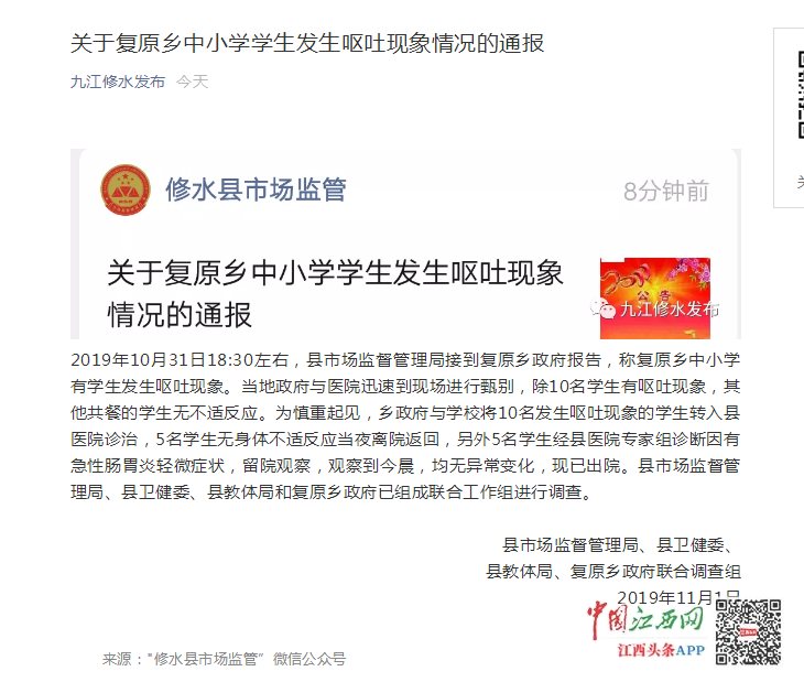 11月1日上午,修水縣市場監(jiān)管局管理局發(fā)布通報稱,2019年10月31日18:30左右,縣市場監(jiān)督管理局接到復(fù)原鄉(xiāng)政府報告,稱復(fù)原鄉(xiāng)中小學(xué)有學(xué)生發(fā)生嘔吐現(xiàn)象。當(dāng)?shù)卣c醫(yī)院迅速到現(xiàn)場進(jìn)行甄別,除10名學(xué)生有嘔吐現(xiàn)象,其他共餐的學(xué)生無不適反應(yīng)。為慎重起見,鄉(xiāng)政府與學(xué)校將10名發(fā)生嘔吐現(xiàn)象的學(xué)生轉(zhuǎn)入縣醫(yī)院診治,5名學(xué)生無身體不適反應(yīng)當(dāng)夜離院返回,另外5名學(xué)生經(jīng)縣醫(yī)院專家組診斷因有急性腸胃炎輕微癥狀,留院觀察,觀察到今晨,均無異常變化,現(xiàn)已出院。縣市場監(jiān)督管理局、縣衛(wèi)健委、縣教體局和復(fù)原鄉(xiāng)政府已組成聯(lián)合工作組進(jìn)行調(diào)查。