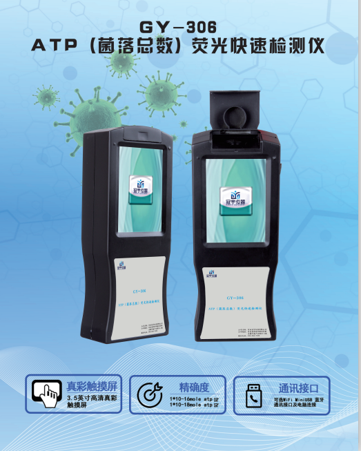 GY-308菌落總數ATP熒光檢測儀是河南冠宇儀器有限公司基于螢火蟲發光原理,利用“熒光素酶—熒光素體系”研制而成;由于所有生物活細胞中含有恒量的ATP,所以ATP含量可以清晰地表明樣品中微生物與其他生物殘余的多少,菌落總數ATP熒光檢測儀GY-308菌落總數ATP熒光檢測儀適用于食品、飲用水中微生物快速檢測,餐具潔凈度快速檢測,食品加工器具、工作臺面、餐飲器具等消毒結果快速檢測,醫療環境工作平臺即時評估。該設備采用生物化學反應方法檢測ATP菌落總數含量。