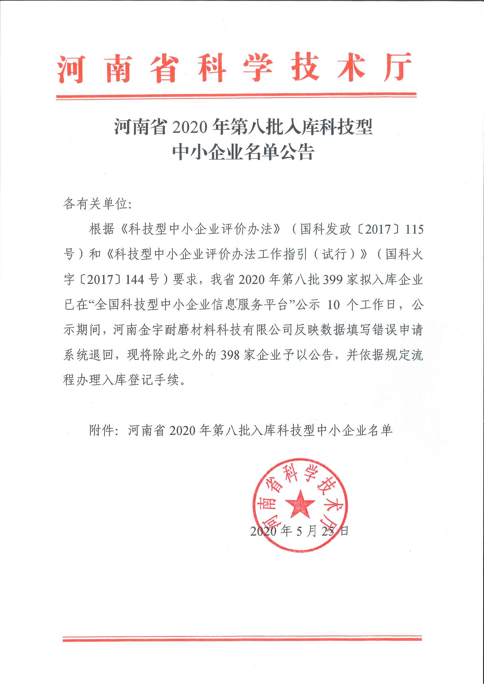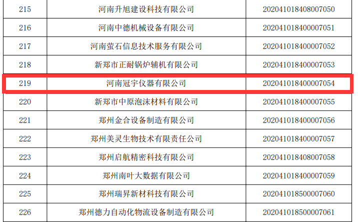 根據(jù)《科技型中小企業(yè)評價辦法》(國科發(fā)政〔2017〕115號)評價指標要求,國家科技部火炬中心《關(guān)于組織開展2020年科技型中小企業(yè)評價工作的通知》(國科火字〔2020〕44號),認定河南冠宇儀器有限公司成為“國家科技型中小企業(yè)”,并獲得榮譽稱號,編號為:202041018400007054。