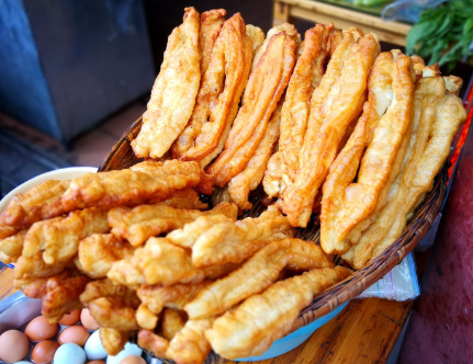 油條以小麥粉和水為主要原料,以膨松劑為主要輔料,經面團調制、醒發、成型、油炸而成,外皮酥脆且內里松軟多孔,色澤金黃、咸香適口,是我國傳統的早餐食品和大眾化小吃,但食用也有講究。