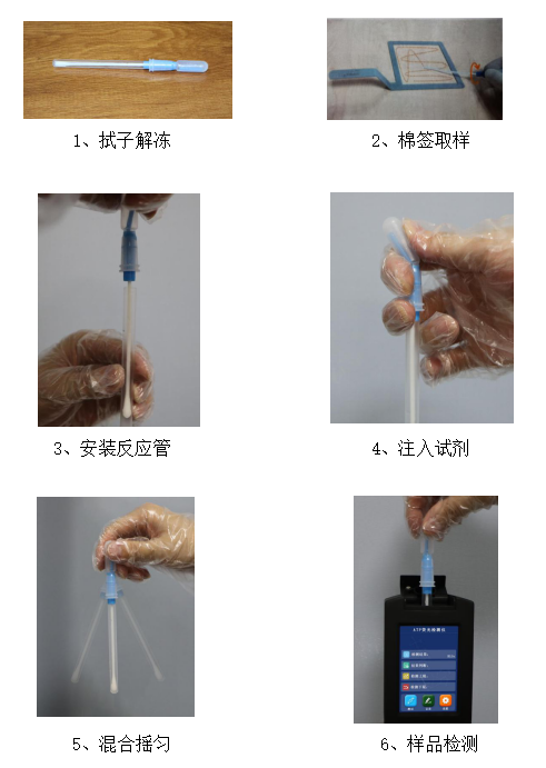 6、樣本檢測(cè):將拭子插入處于待檢測(cè)界面的ATP儀器實(shí)驗(yàn)倉(cāng)內(nèi),閉合儀器上蓋,開(kāi)始檢測(cè)。