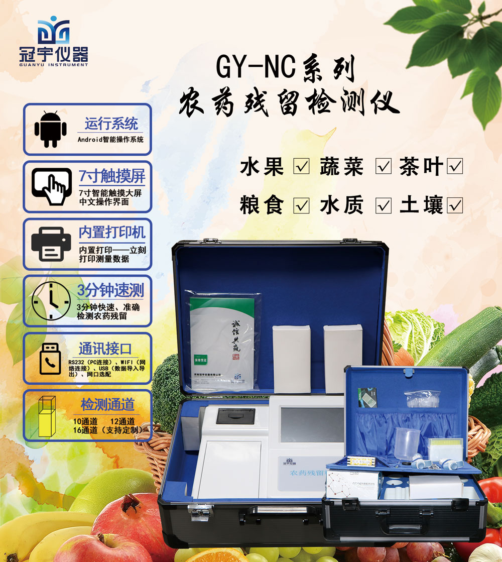 農(nóng)藥殘留傷害不容忽視,相應(yīng)的監(jiān)管部門也應(yīng)加強農(nóng)藥殘留的監(jiān)管檢控工作,維護好食品安全。冠宇儀器新一代智能型農(nóng)藥殘留檢測儀可廣泛應(yīng)用于各級政府蔬菜檢測中心、農(nóng)貿(mào)市場、超市、環(huán)保機構(gòu)、蔬菜種植基地、飯店、車載及實驗室等食品安全檢測與監(jiān)控場所等單位對果蔬中農(nóng)藥殘留的檢測。能準(zhǔn)確、快速檢測出蔬菜、水果、糧食、茶葉以及土壤中有機磷和氨基甲酸脂類農(nóng)藥殘留的快速檢測。