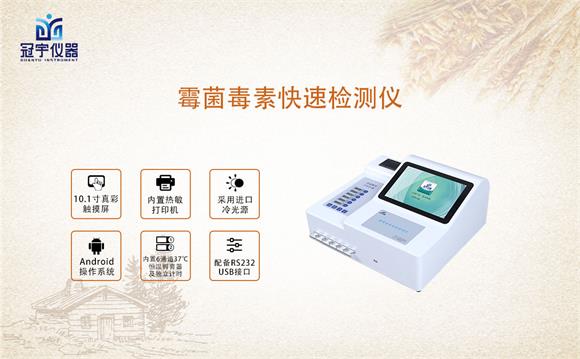 冠宇儀器霉菌毒素檢測儀應用競爭抑制免疫層析的原理,通過檢測線熒光定量卡中的熒光強弱程度,定量分析待檢樣品中霉菌毒素殘留含量,能夠快速定量檢測糧食、飼料、谷物、食用油、調味品等食品中黃曲霉毒素、T2毒素、嘔吐毒素、赭曲霉毒素、伏馬毒素、玉米赤霉烯酮含量。適用于糧油監測中心、糧油飼料生產加工、食品加工貿易、畜禽養殖戶自查、工商質監部門用于市場快速篩查等。