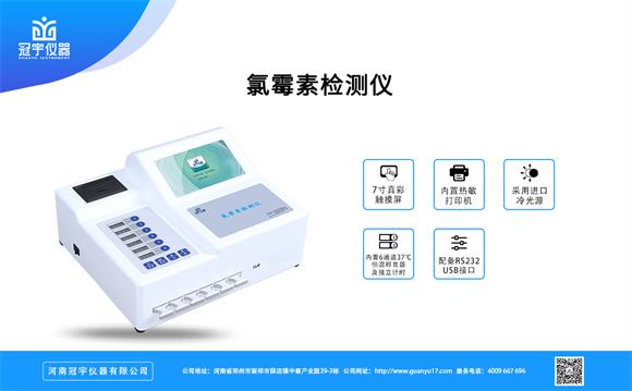 河南冠宇儀器有限公司專業生產氯霉素檢測儀GY-720應用競爭抑制免疫層析的原理,通過檢測線熒光定量卡中的熒光強弱程度,定量分析待檢樣品中氯霉素殘留含量。適用于食品安全監測中心、食品生產加工、食品加工貿易、畜禽養殖戶自查、工商質監部門用于市場快速篩查等。