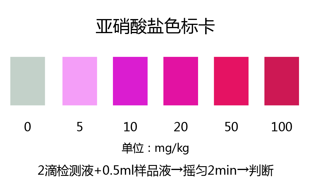 2.1:2分鐘后觀察檢測(cè)管中顏色的深淺,紫紅色顏色越深,表示樣品中亞硝酸鹽的含量越高。