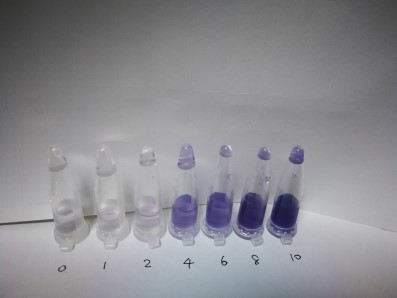 1.3:吸取10滴純凈水于檢測(cè)管,加入加1滴檢測(cè)試劑A和1滴檢測(cè)試劑B,搖勻15秒后再加2滴檢測(cè)試劑C,搖勻。