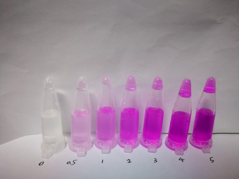1.2:各取樣品液和純水1ml于離心管中,依次加入0.5 ml檢測試劑A,3滴試劑B,搖勻。